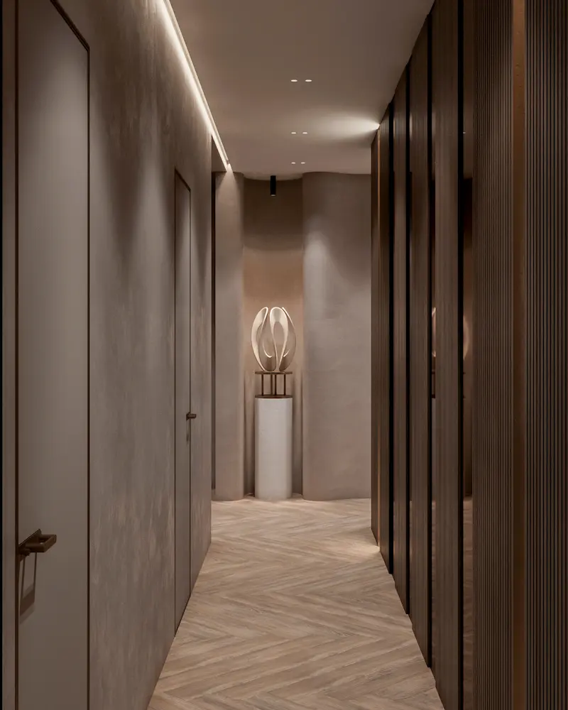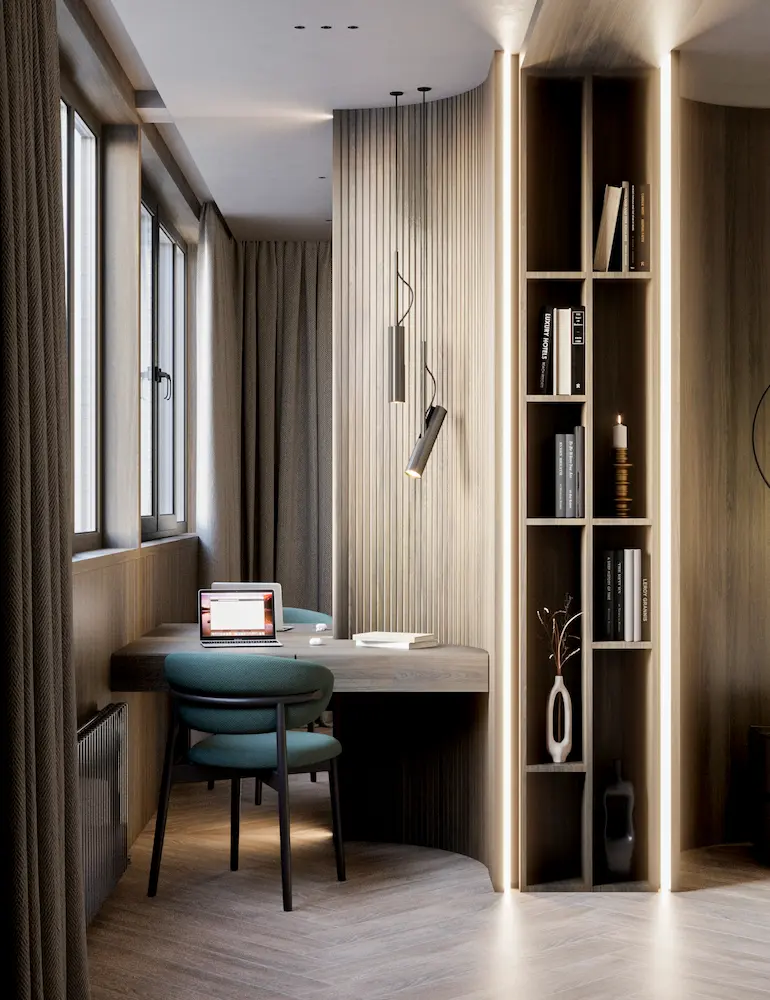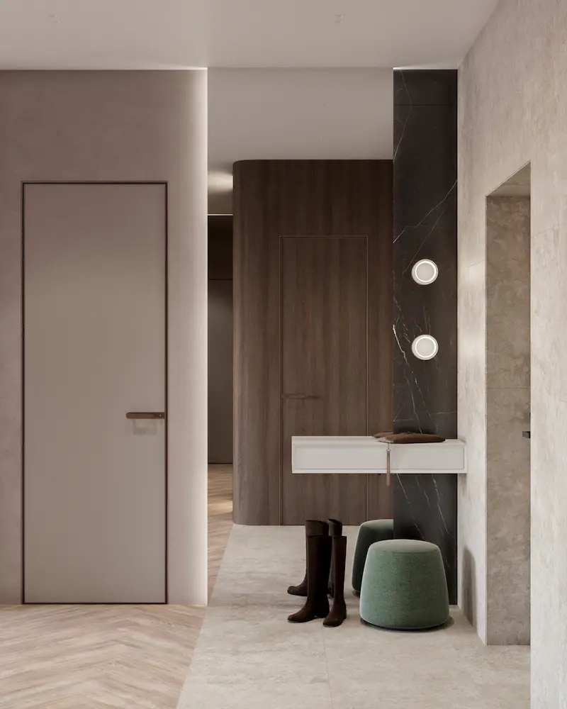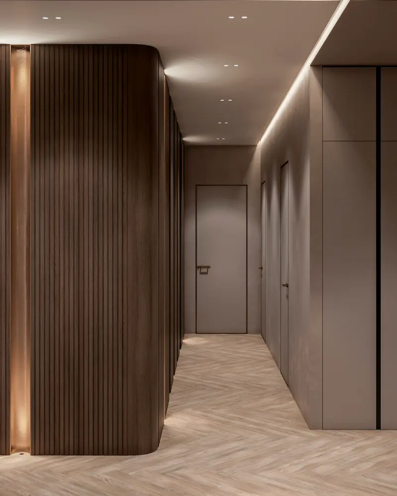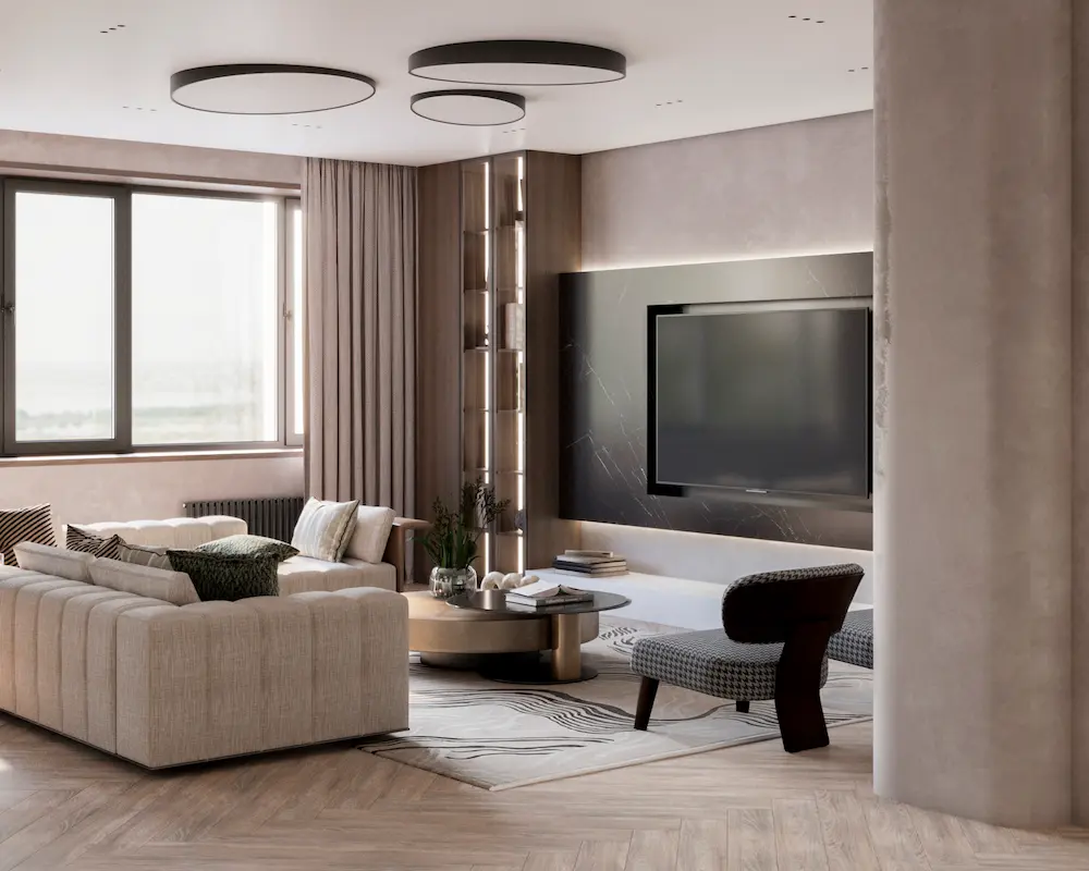 Проект квартиры в доме на набережной Оки разрабатывался для семьи из трех человек. Теплая цветовая гамма, обогащенная природными оттенками, легли в основу концепции интерьера. Натуральные материалы играют здесь первостепенную роль. Дерево, камень, лен, хлопок, шерсть – все они привносят в дом тепло и уют, создавая ощущение близости к природе.
